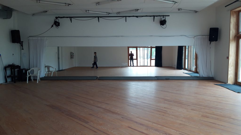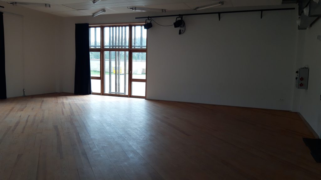 Sol parquet couleur bois (recouvert par Tapis de Danse noir ou Moquette noir)